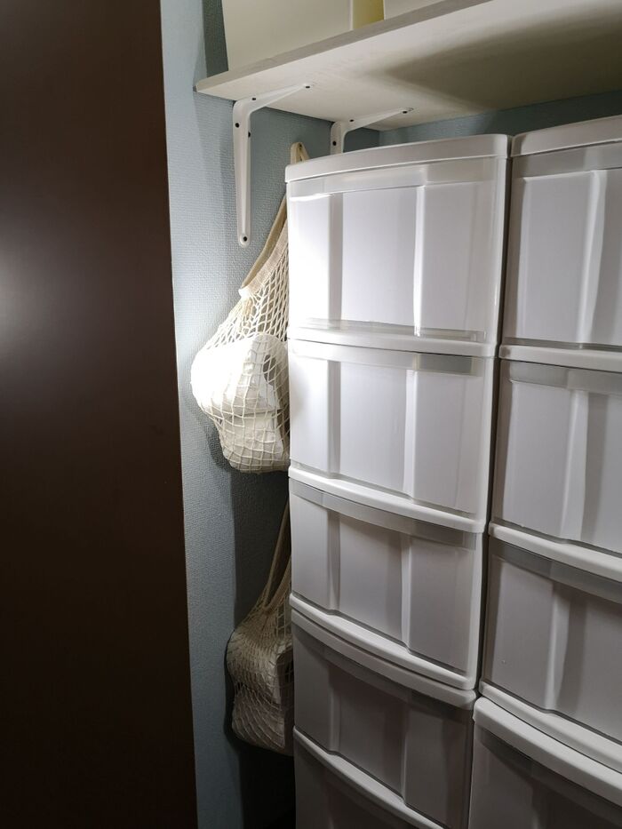 100均の編みバッグにトイレットペーパーを収納してストックしています。