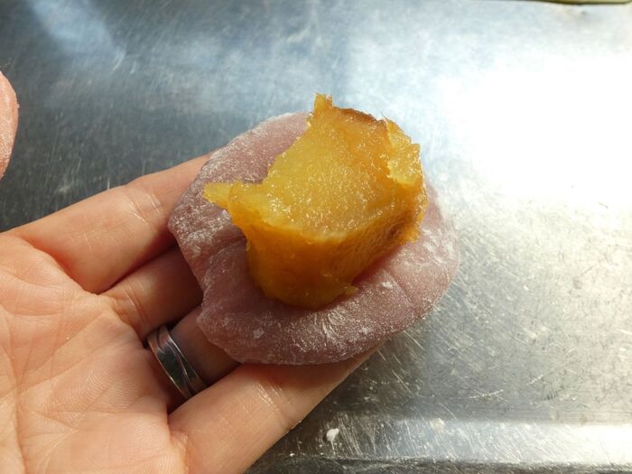 大福の生地が冷めたら12等分にして、片栗粉をつけながら丸くのばします。