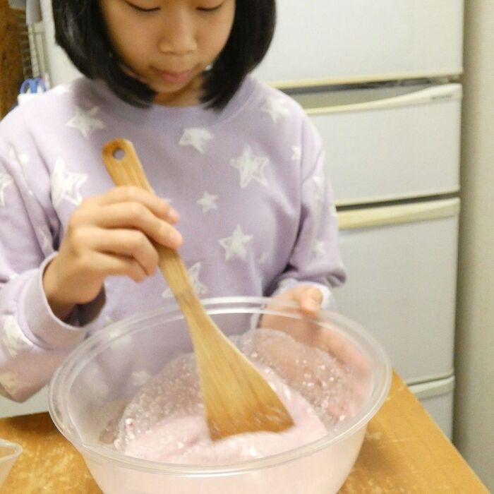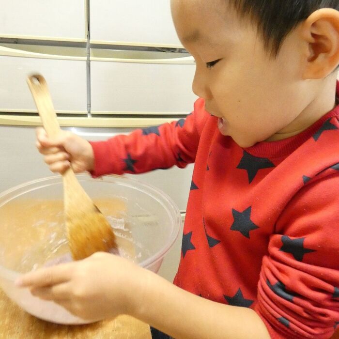 餅の生地をしっかり混ぜ合わせるともちもちになります。