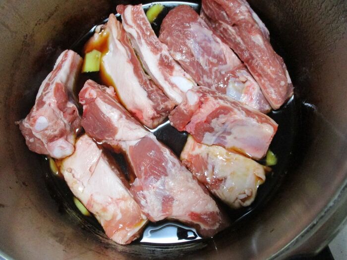 ①圧力鍋(今回フィスラー社のもの)に、豚スペアリブと@の調味料と水、生姜を加え、蓋をして、強火にかける、圧力鍋の表示ピンが2目盛りになったら、火を弱め、2目盛りを維持しながら、12分程加圧する、12分加熱したら、火を止め、表示ピンが自然に元の状態に戻るまで、何もしないで放置する、元の位置に戻ったら、蓋をはずします