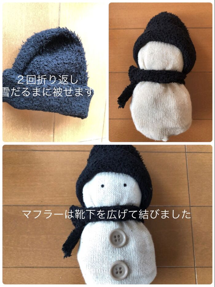 ・2回折って雪だるまに被せ、マフラーを巻いてお好みでボタンをつけたり目を油性ペンで描きます。