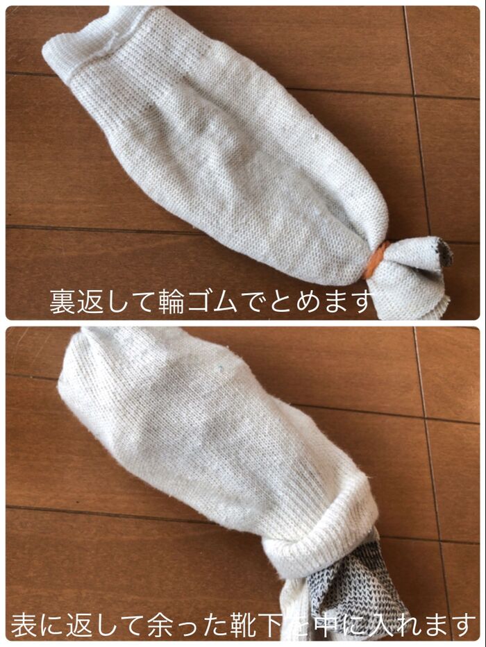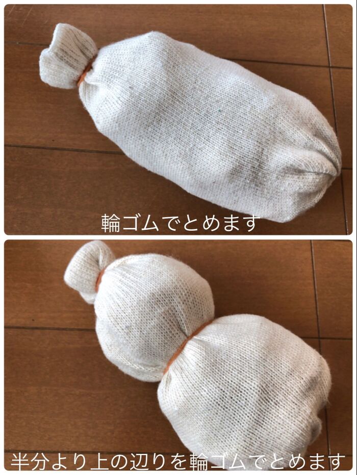 ・輪ゴムを使って胴体の下の部分になる部分を輪ゴムでとめ、要らない靴下を中に入れます。