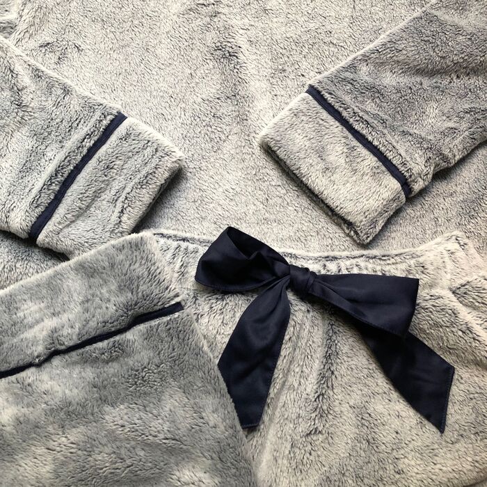 袖と足裾には同系統の色でパイピング。そして、パンツのウエスト部分にはリボン。