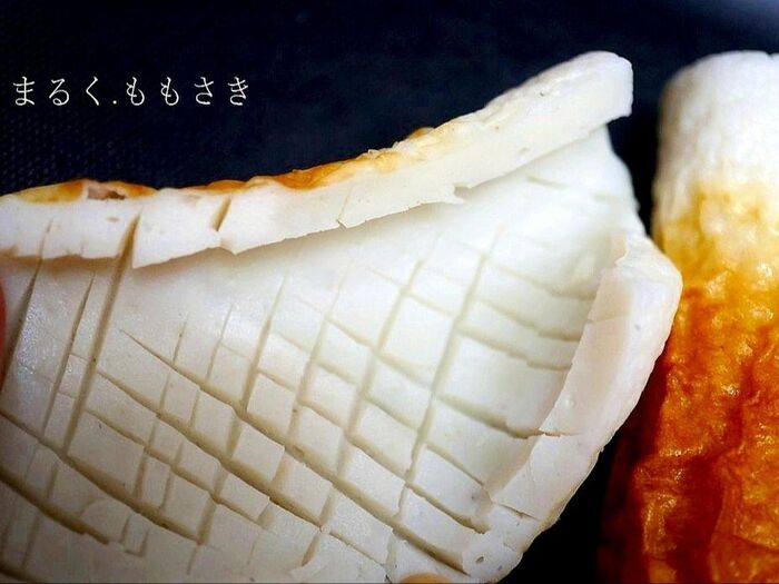 ●ちくわにハサミで切り込みを入れ開き、内側を包丁で両方から斜めに隠し包丁を入れる。