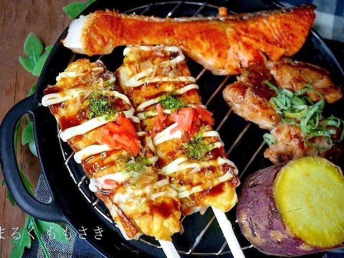 あと先日お家キャンプで作った柔らかチキンのガーリックソテー(この日にこのお好み焼きも作りました)さつま芋を乗せ、かす汁とご飯を添え家族に出しました。