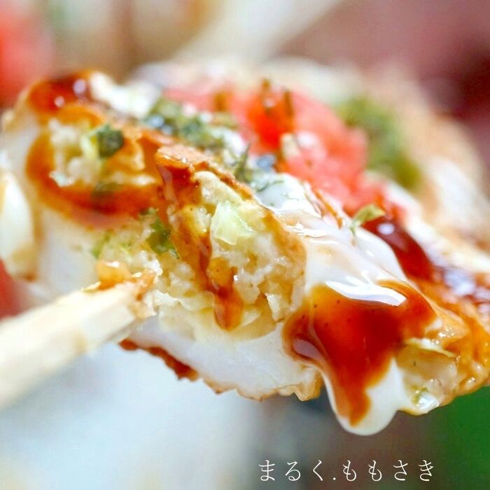 後はマヨネーズ、お好み焼きソース、かつお節、紅生姜、青海苔を適量乗せる。