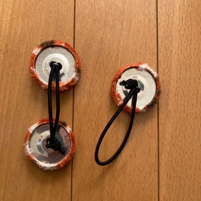 押し具に布を入れ、表ボタンを合わせ、ひだを整え、裏に入り切るようにパーツを合わせて、カチッと音がするぐらいに手で押し込む。細いロングヘアゴムを22センチぐらいにカットして、ゴムの両端を裏パーツの穴に入れて結び、輪になっている反対側の方を結び目の下の輪に入れて引っ張り、結び目が出てこない様にする。2個のボタンのゴムも同じ様に裏の穴に両端入れて結び、結び目の下の輪に片方のゴムを通したボタンをくぐらせ、結び目が見えないようにする。