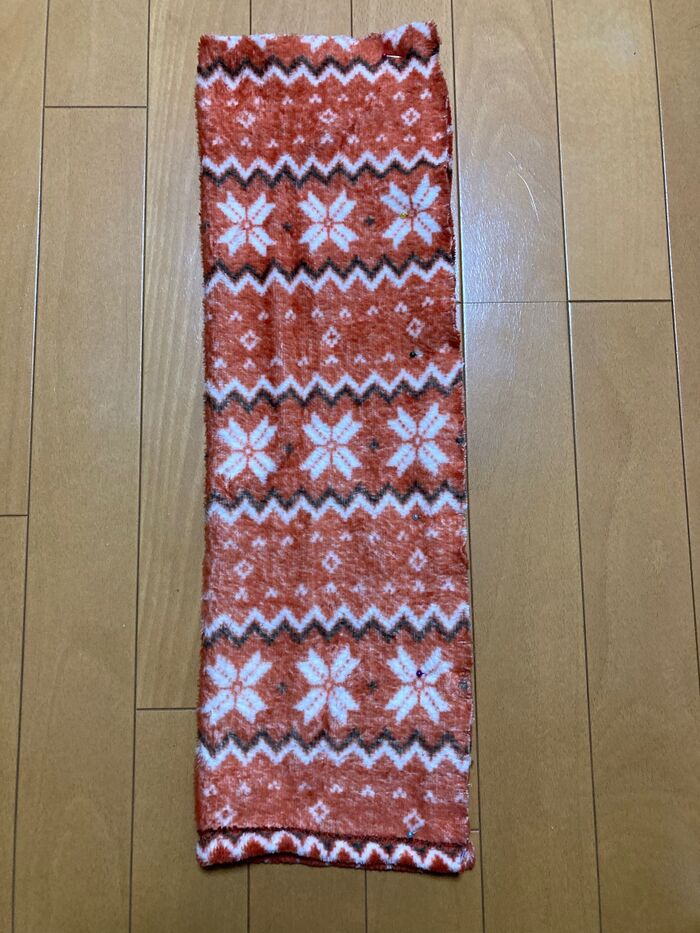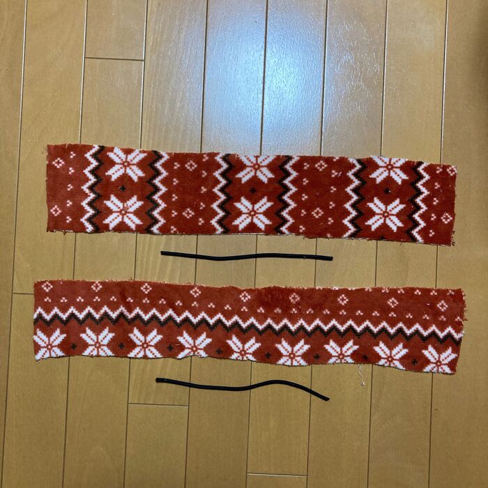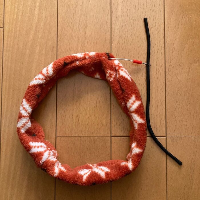 10×50センチにカットした布を中表に横半分に折り、横の端を縫い合わせ、重なっている2枚の布の、内側の布を三つ折りにし、外側の布で包み込んで、外側の布を縫い合わせながら、少しづつ中から、内布を引っ張り出しながら縫い進み、端5センチ残し、そこの穴から表にひっくり返し、ゴムをいれ、返し口をまつり縫いで閉じる。