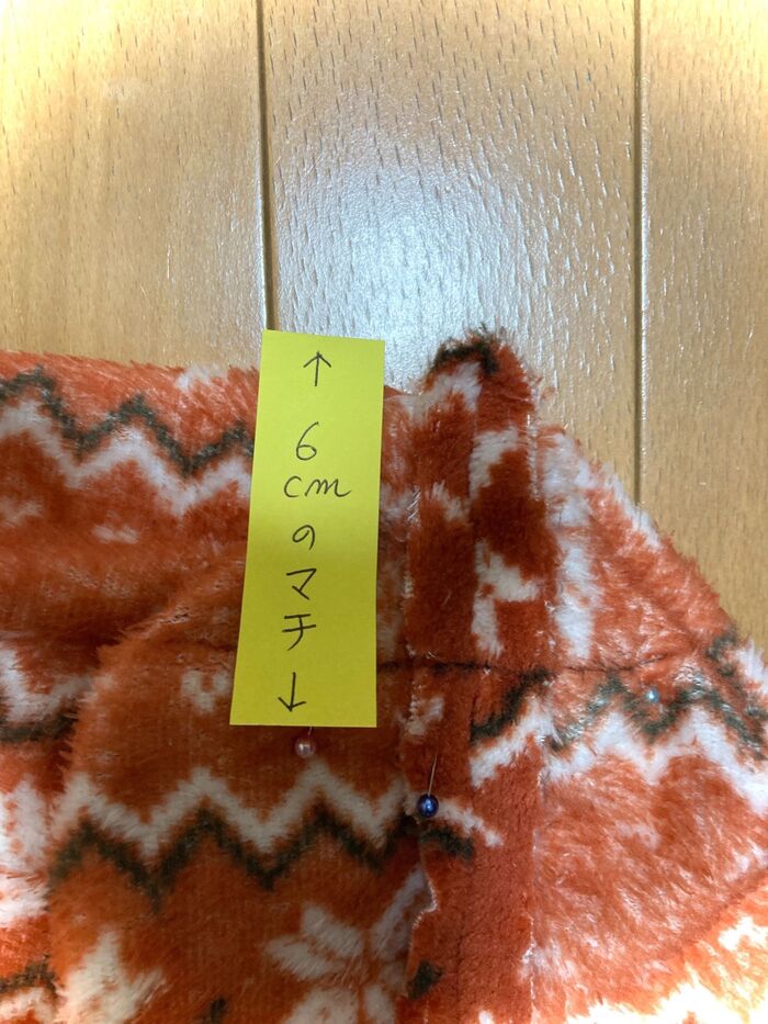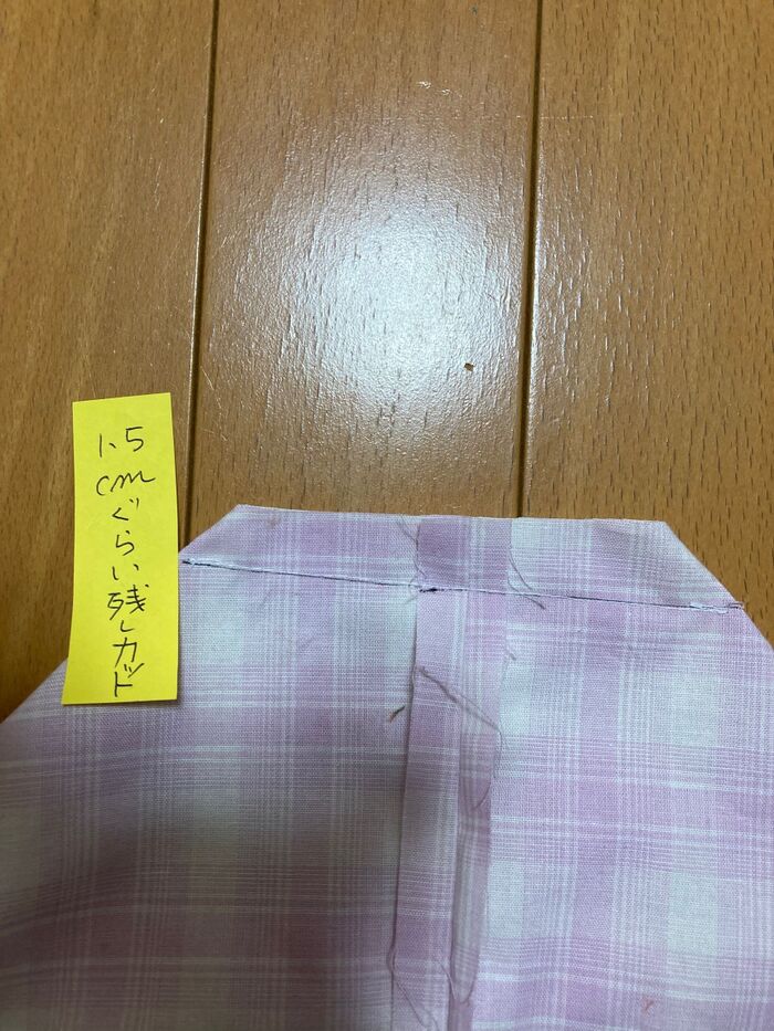 表布、裏布とも、6センチのマチを両側に作り、縫ったら、1.5センチ残して上を切り落とす。