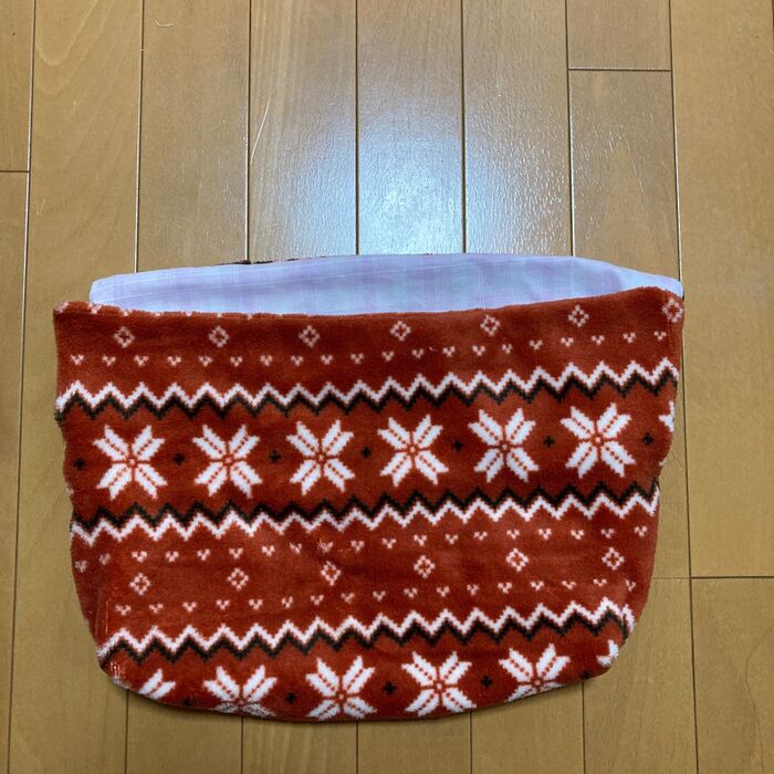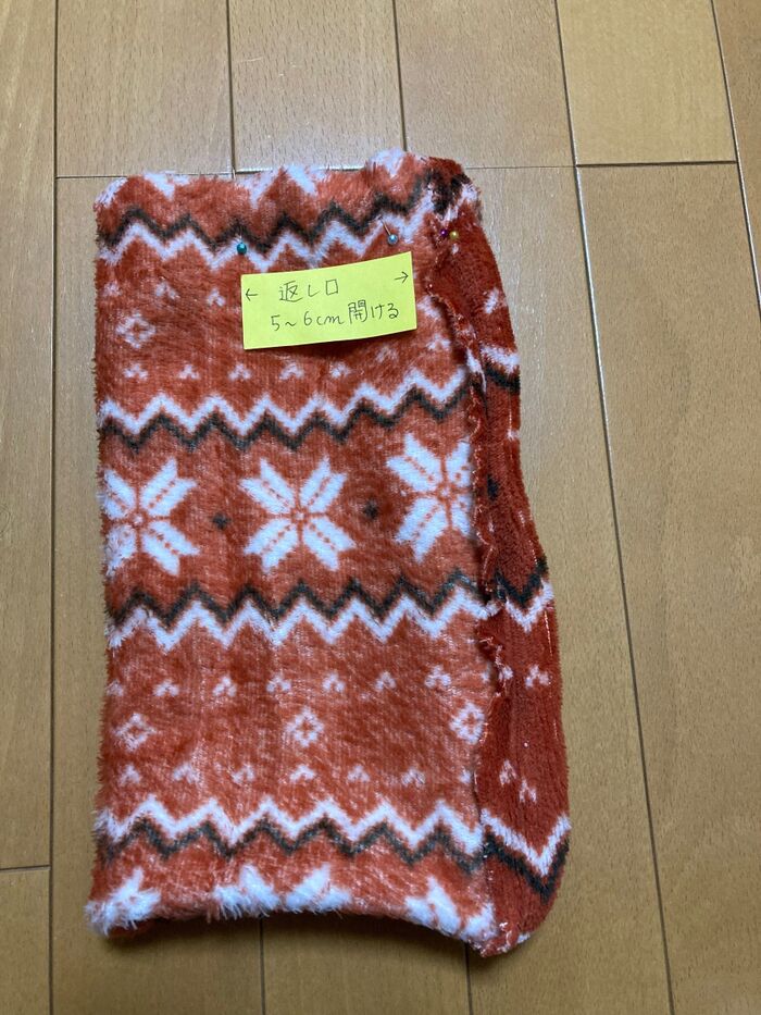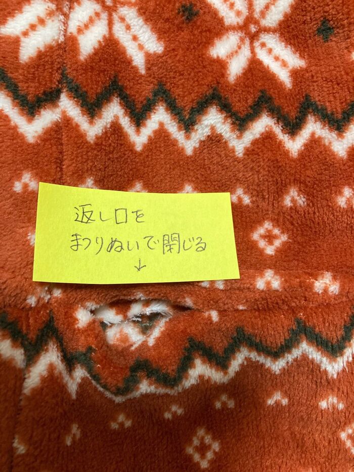 返し口から、表布を出し、ネックウォーマーの形にできたら、返し口をまつり縫いで閉じる。