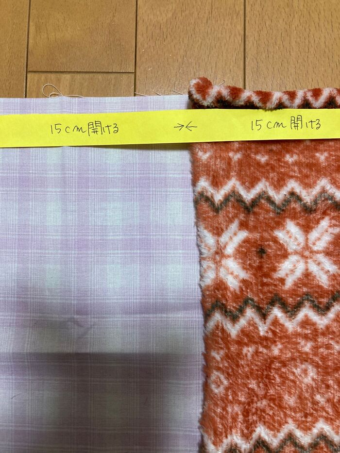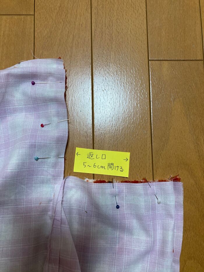 脇は、ハンドル通し口を作るため、中心から15センチで開閉部分を作る。片側に5センチぐらいの返し口を残し、縫い合わせ、ひっくり返して表布を出す。