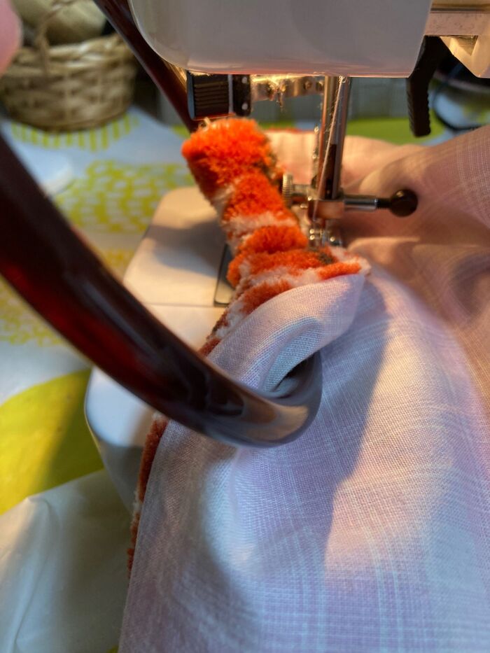 ブランケットの生地が伸び縮みするので、普通のミシン糸の場合は、引っ張り加減を調整し縫っていきます。引っ張り過ぎにご注意です。バックは、裏布を同じポリエステル素材で作ると、作りやすいかと思いますが、手持ちのコットンでも、大丈夫です。