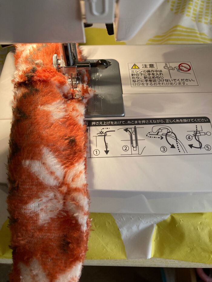 長い辺を縫ったら、中表に半分にして、返し口を5センチぐらい開けて、筒状になる様に縫っていく。