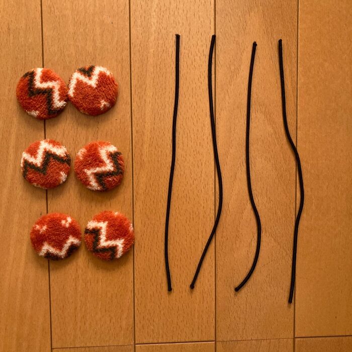 くるみボタン用布の円は直径6.3センチです。ヘアゴムは22センチです。布は6枚取れましたが、布の大きさによっても多少変わってきます。くるみボタンの裏面のアシに通すので、細いロングゴムを使います。