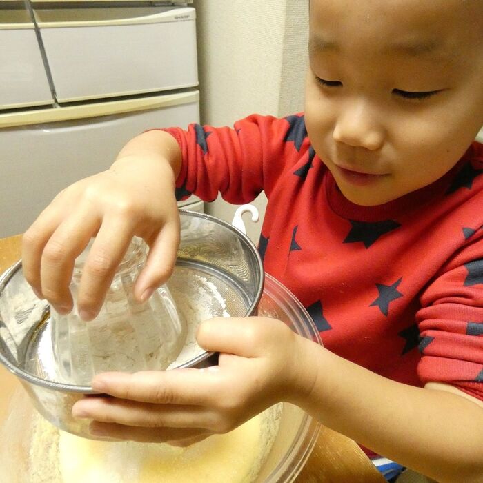 ★印の材料をふるい、ピスタチオパウダーも合わせてゴムべらでさっくり混ぜ合わせます。