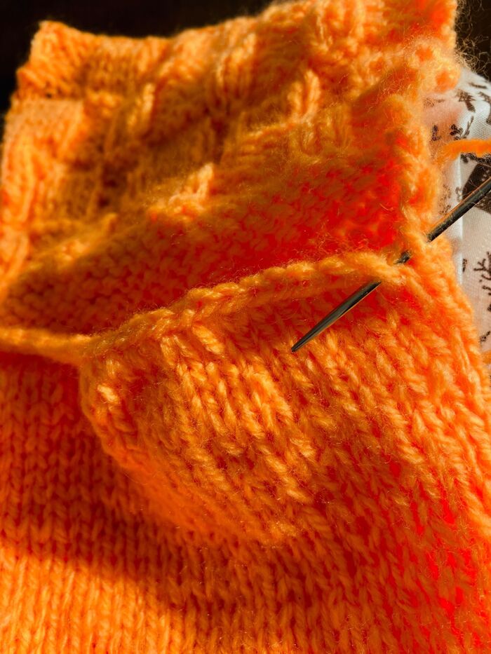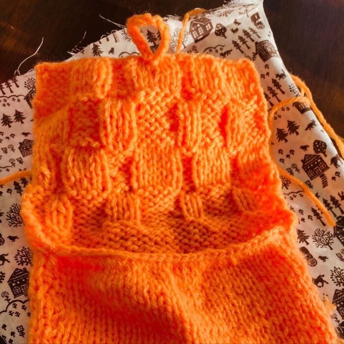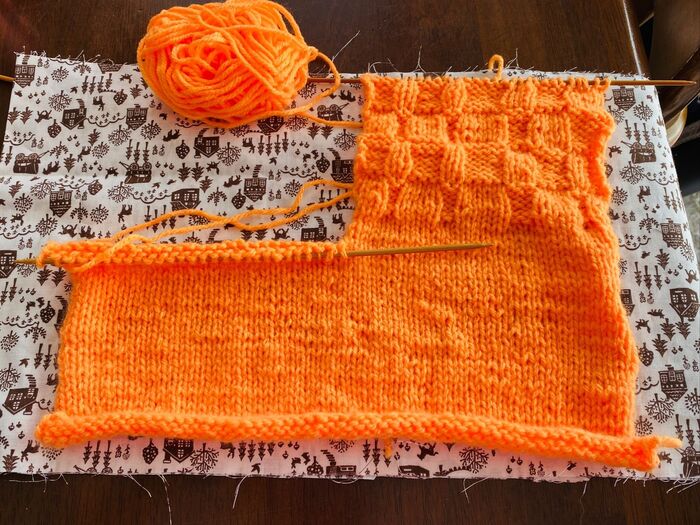 38段模様編みします。表編みと裏編みで市松模様風に編みました。