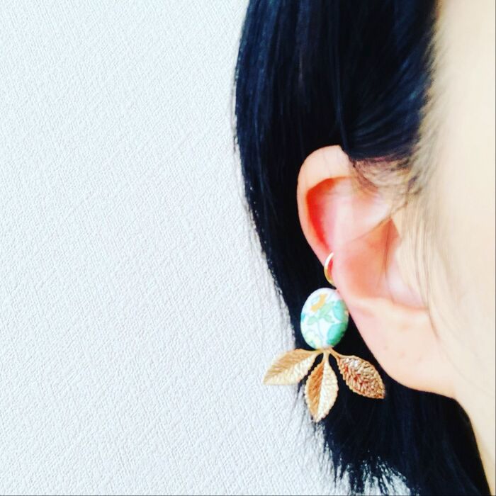 貴和製作所さんでイヤーカフのパーツとリーフ型のパーツを購入し、オリジナルのくるみぼたんを丸カンで繋いでイヤーカフを作りました。(※金属アレルギーの方やメッキ加工が肌に合わない方はご遠慮ください。)