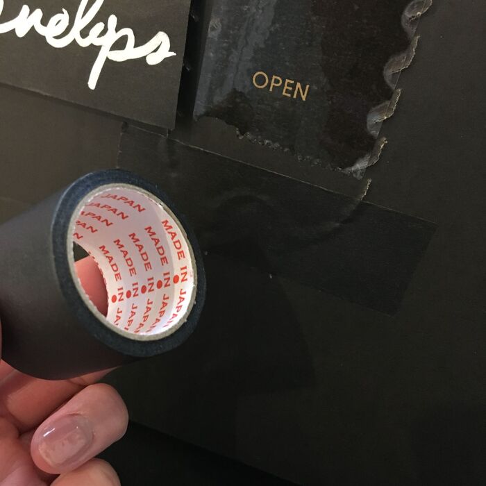 Daisoで売っている黒いマスキングテープでロゴを隠しています。