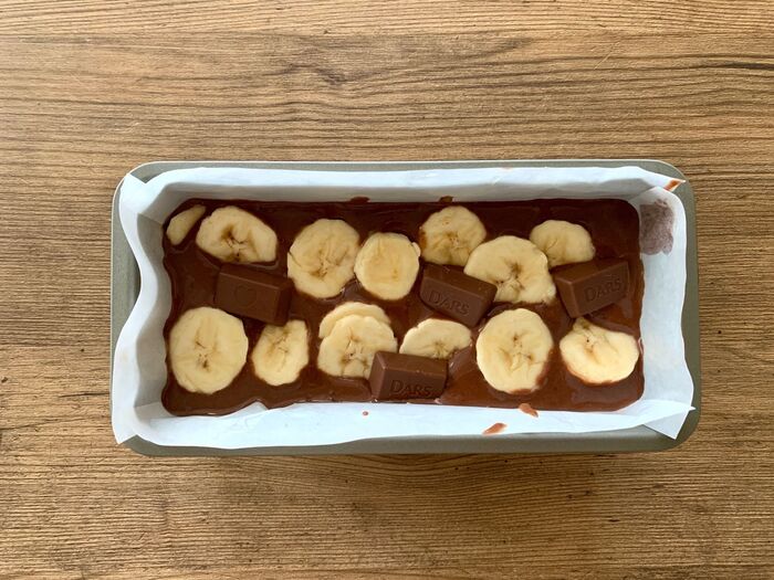 パウンド型に流し入れてスライスしたバナナと残りの板チョコをのせ、180度のオーブンで45分焼く。