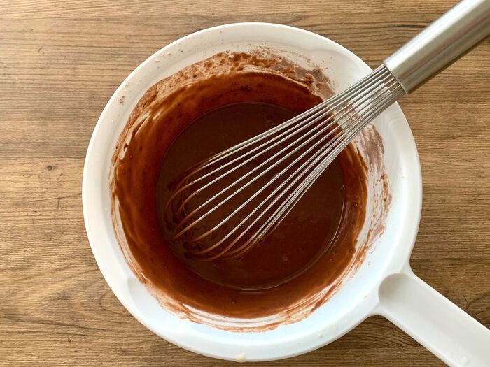 ②別のボウルに【B】を入れ、泡立て器でよく混ぜたら、【A】を加えてよく混ぜる。
