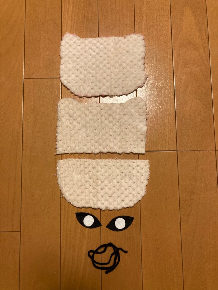 黒い毛糸で、ひげを顔の端から2.5センチ、下から1センチぐらいの位置に、3本、2センチぐらいの長さで、バランスをみて縫い付ける。
