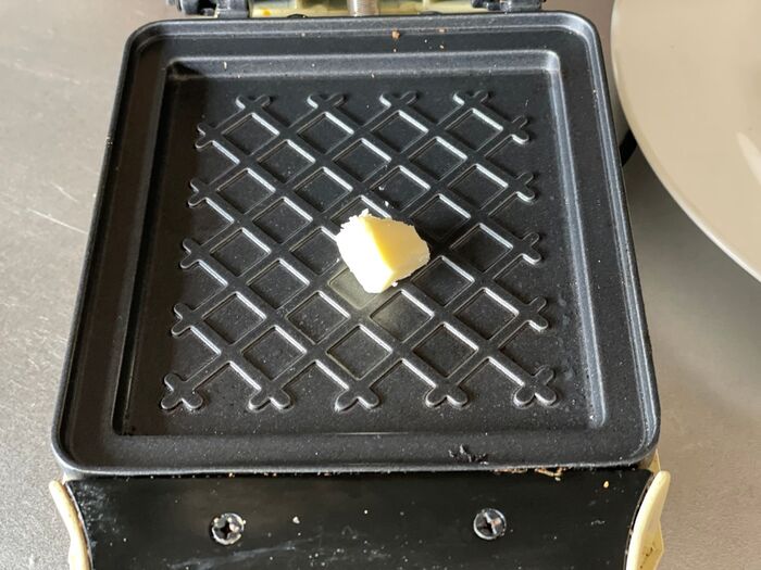 平らな底面をうえにしてバターを乗せてぎゅーっと圧縮してこんがり焼きます。