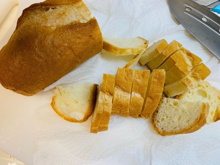 フランスパンは輪切りにして、それを半分に切ります。