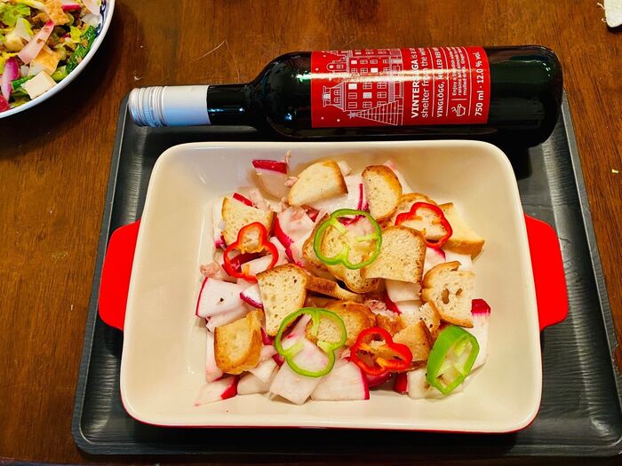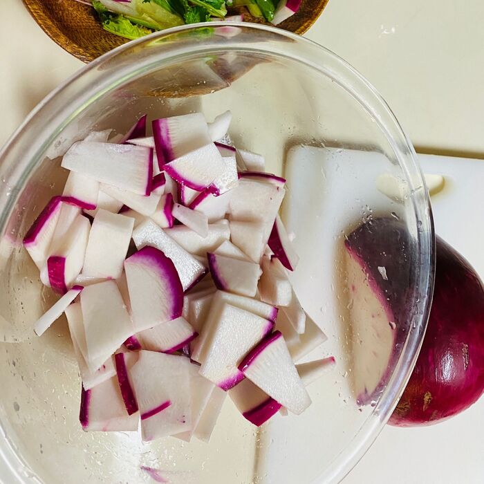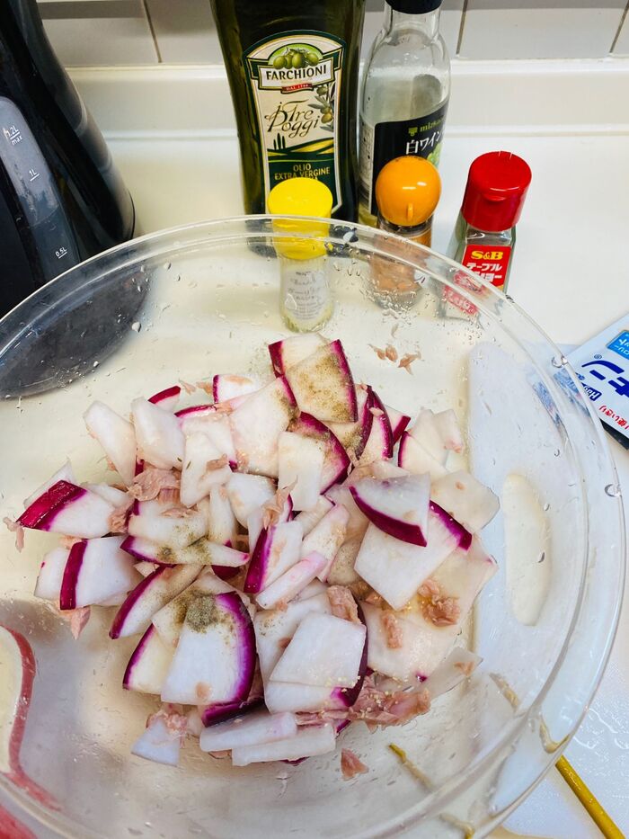 水気を切ったかぶにワインビネガー、オリーブオイル、胡椒、ガーリックパウダー、クミンを入れてよくあえます。