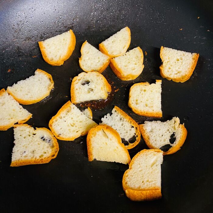 カリカリのフランスパンを盛り付けます。