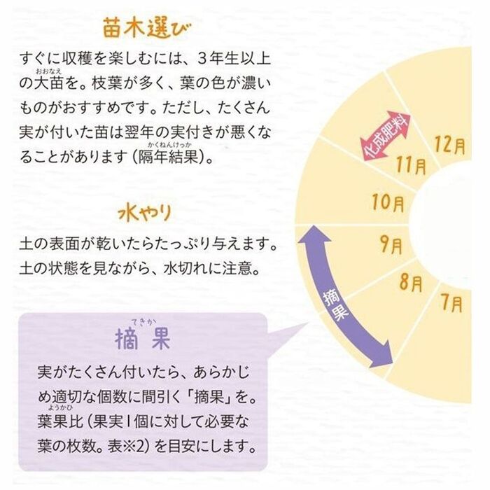 メリット(2) 根や枝葉の伸びを抑えて育てるので、花や果実に回る養分が充実し実付きがよくなる。また、初結実までにかかる年数も、庭植えに比べて早くなる傾向に。
