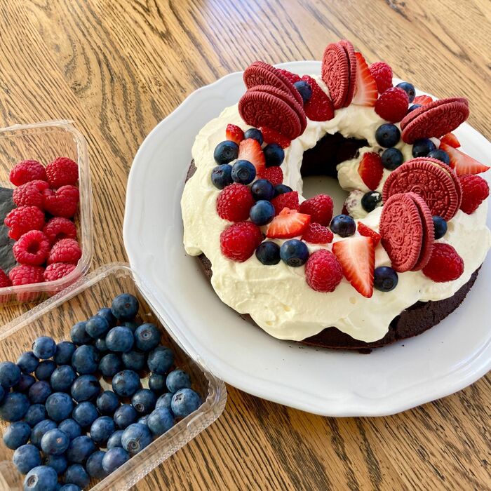 デコレーションに絞り袋などを使う必要がなく、クリームとフルーツを適当に乗せるだけなので、大雑把な私にも作れます♪ お好みで、土台となるチョコレートケーキを普通のスポンジケーキに変えたり、抹茶味にしてみたりするとバリエーションが広がって何度も楽しめますよ。ぜひ試してみて下さいね。