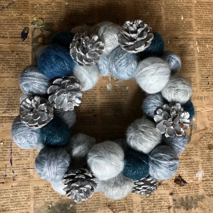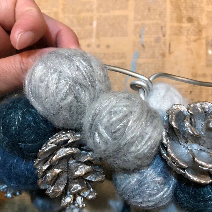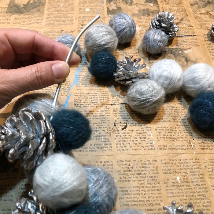 毛糸玉と松ぼっくりをランダムにワイヤーに通していきます。