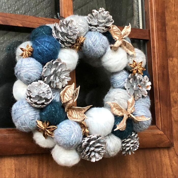 デコレーションボールを核にして、毛糸をグルグル巻きつけ、毛糸玉を作ります。