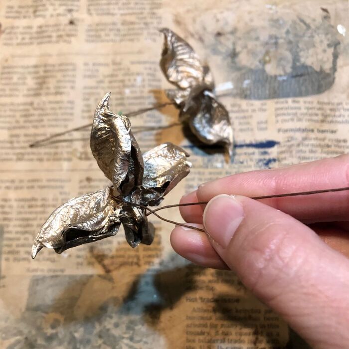 飾りの位置を決め、ワイヤーで捻り止めて、あっという間に完成!