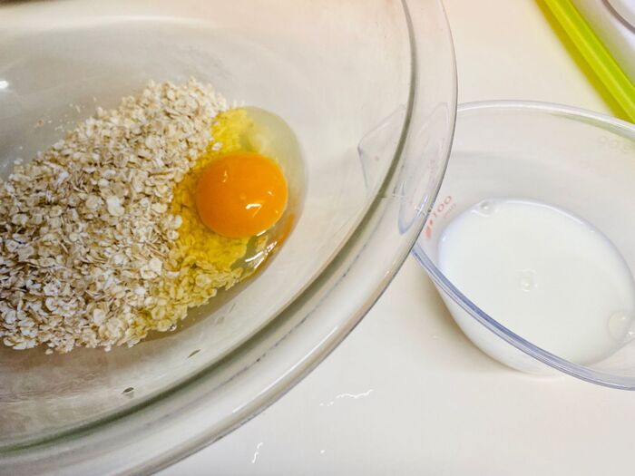 ボールにオートミール、卵、牛乳、オリーブオイルをいれよく攪拌します。