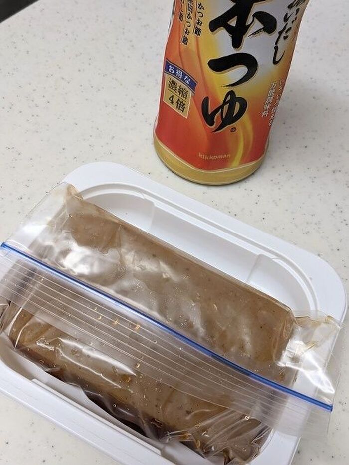 こんにゃくを洗い、そのままジッパーに入れ、めんつゆ(または醤油)をかけて、