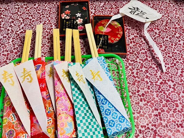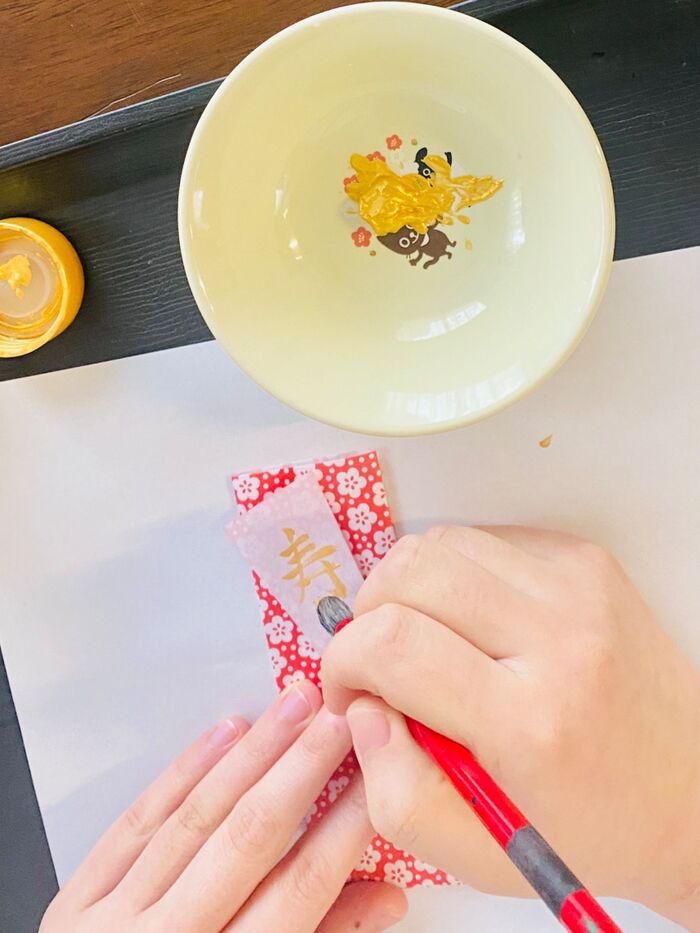 ゴールドのポスターカラーで寿を小筆で書きます。