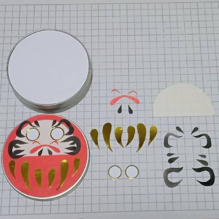 【1】ダルマさんの体の色のシールおりがみなどに、使用する缶で型をとり、カットします。型取りした線の内側を切るようにしてください。
