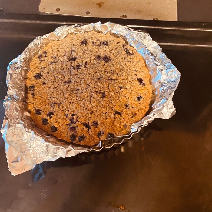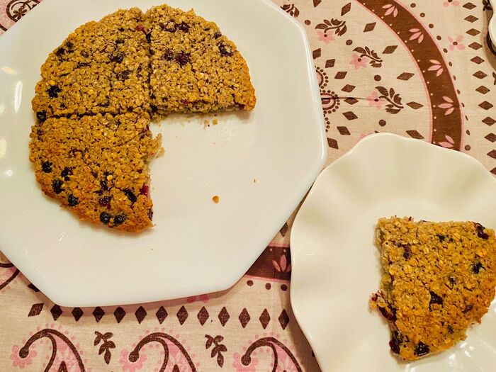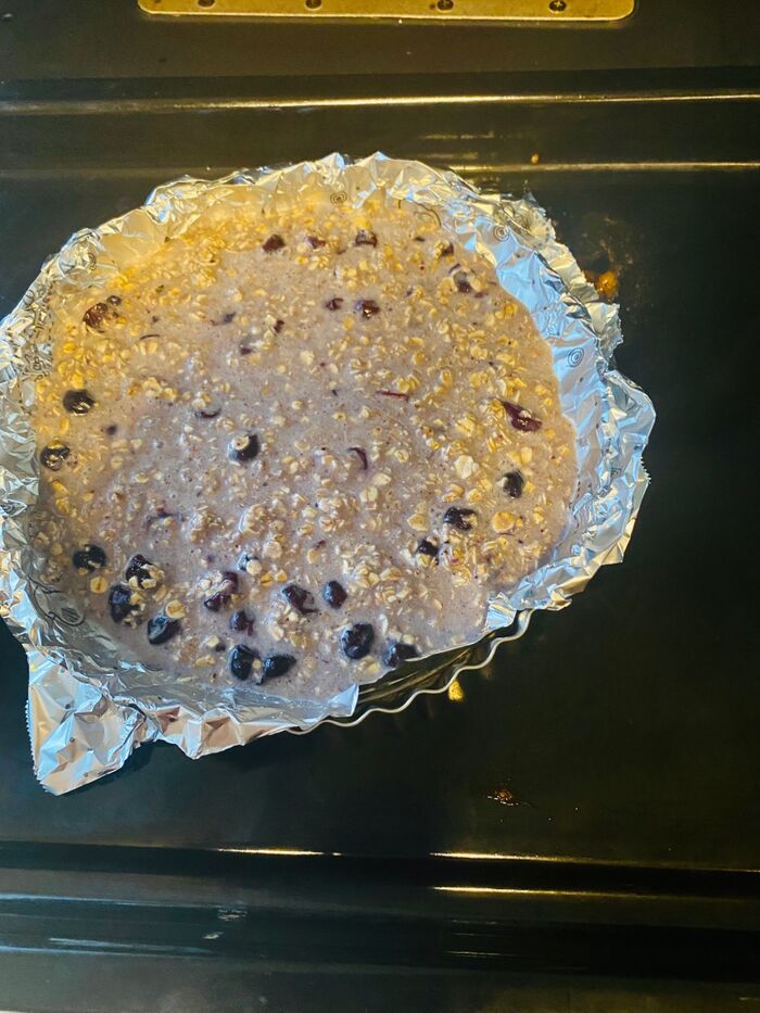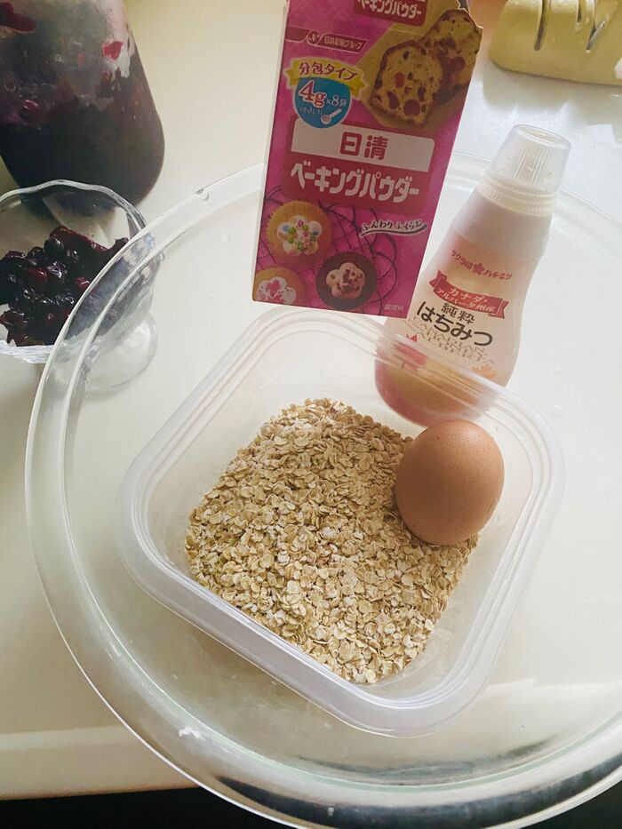 オートミール、卵、牛乳、ハチミツ、ブルーベリージャム