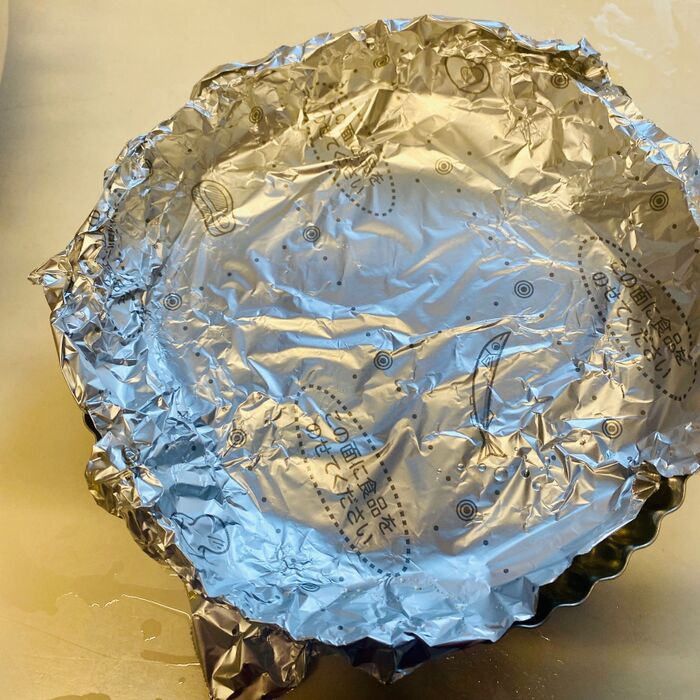 丸いオーブン用の型に、くっかないアルミシートを敷いて