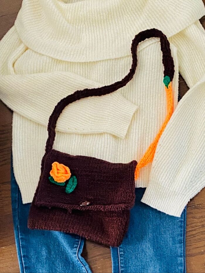 緑の毛糸で編んだ葉と合わせポシエットの、蓋のところに付けます。