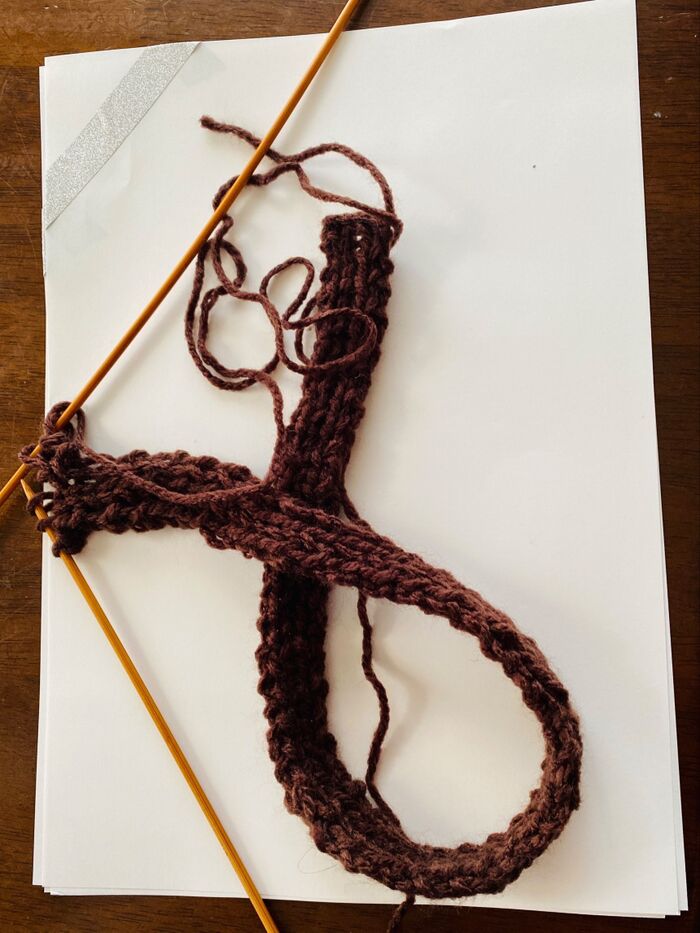 5目作り、ゴム編みで100cmぐらいになるように編んでいきます。