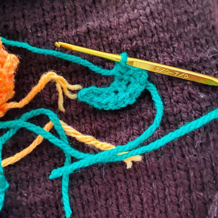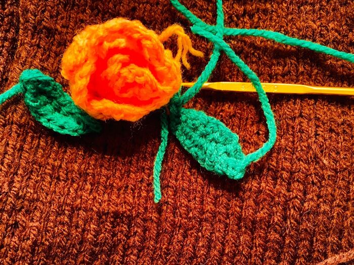 その繋ぎ目のところに、かぎ針で緑の毛糸で葉を編んで、毛糸針でつけました。