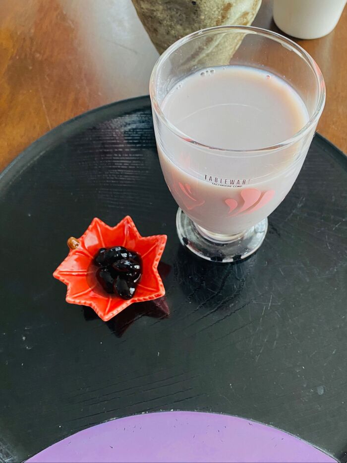 黒豆を取り分けていくうちに、たくさん余った煮汁を牛乳と割ります。