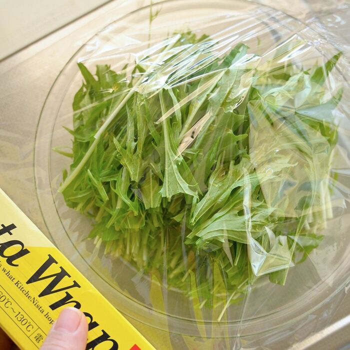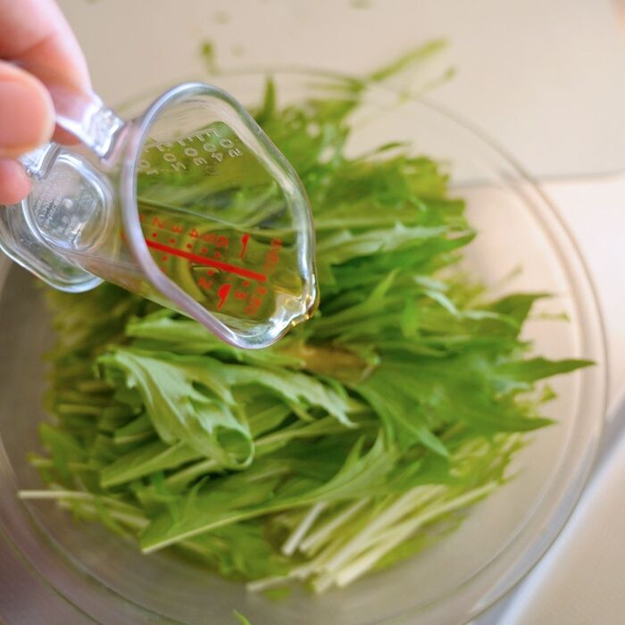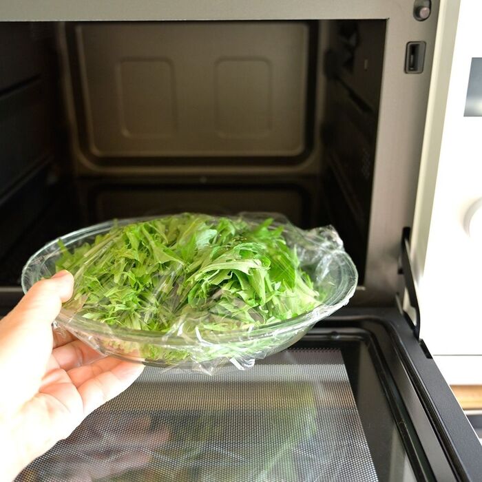 1:水菜を5等分に切り、耐熱皿に茎の方を広げのせ、