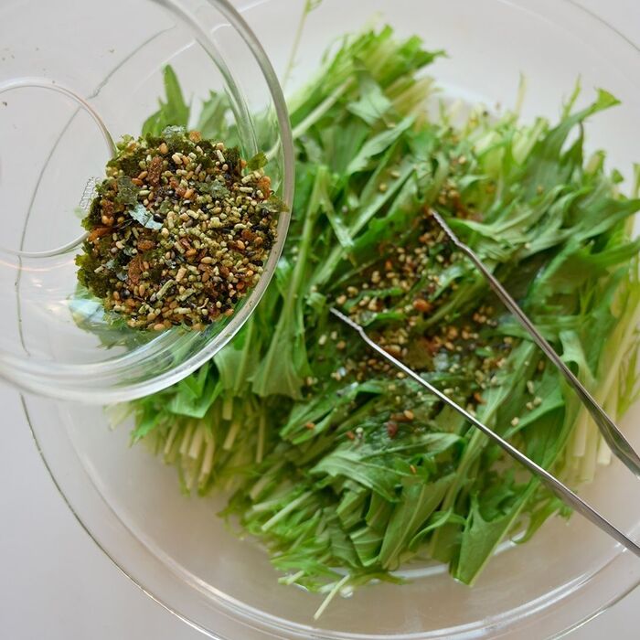ごま油とぽん酢を各半量かけざっくり混ぜ、
