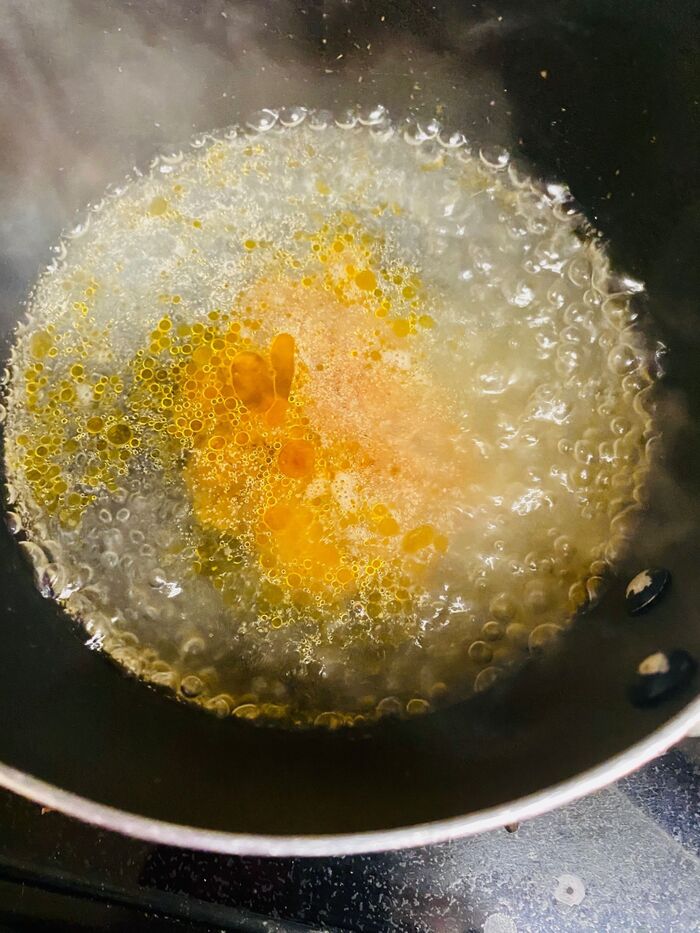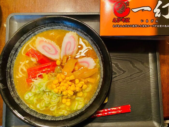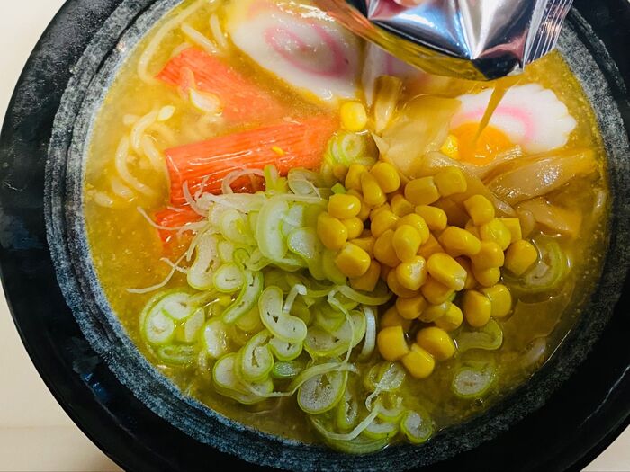 えびたっぷりのスープを注ぎ、お好みの具材をのせ
