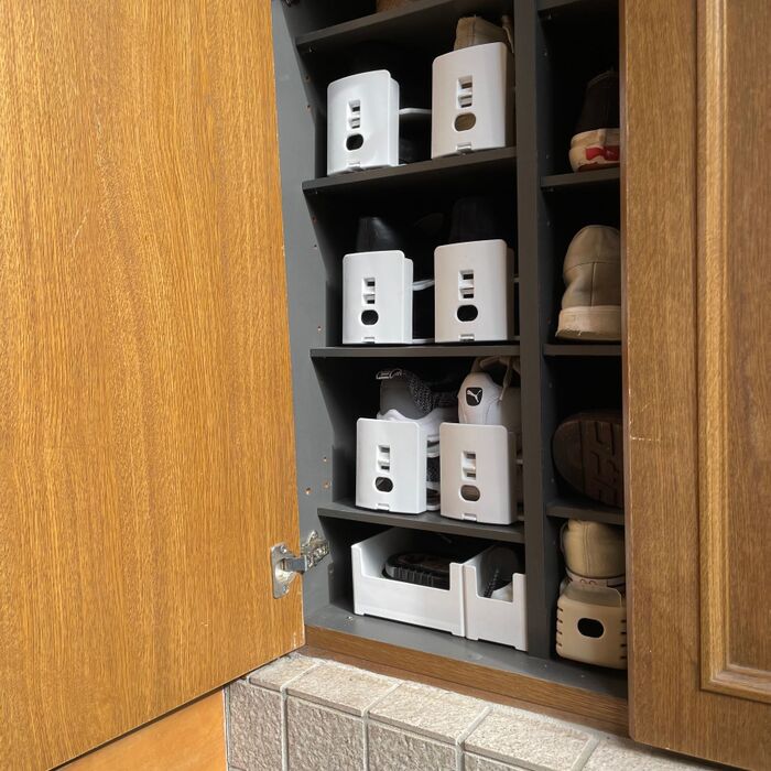 下駄箱の中はこんな感じに。かかと背面部分に高さがあるので見た目もスッキリとなりました。