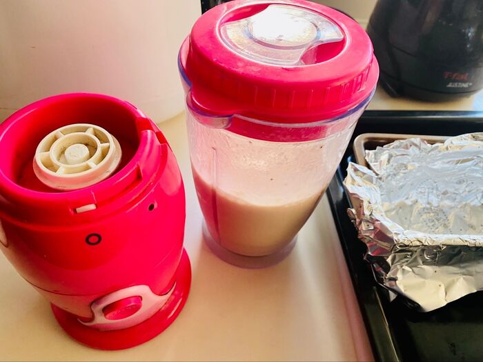 ①ミキサーに、牛乳、バナナを入れてシェイクを作ります。