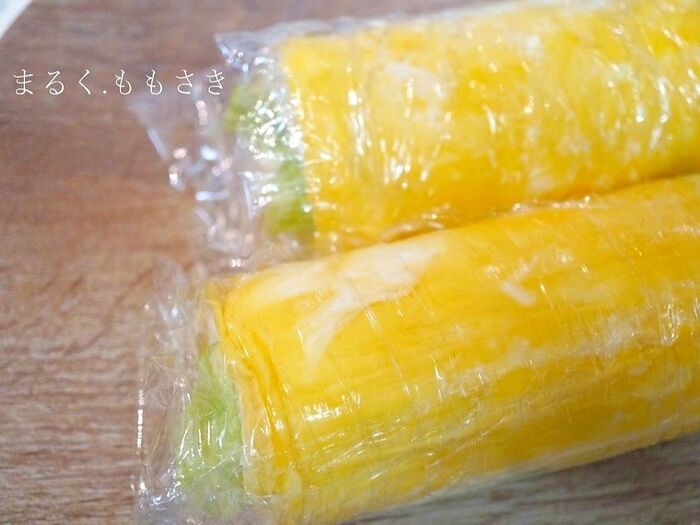 ⑥ラップでしめながらしっかり巻く。全体をラップで巻き冷蔵庫に30分程入れる。